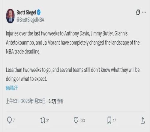 NBA记者Brett Siegel今天写道:“最近两周,安东尼-戴维斯、吉米-巴特勒、字母哥和莫兰特接连受伤,彻底改变了NBA交易格局。距离交易截止日还有不到两周,但很多球队仍然不知道他们要做什么,也不知道接下来会发生什么。”