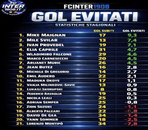 本赛季意甲门将阻止预期进球榜: