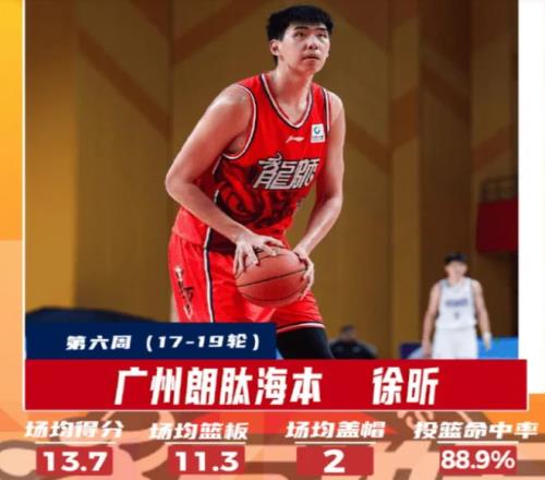 在过去的一周时间里, 徐昕代表广州队打了3场比赛,收获了3连胜,分别击败了北控队、同曦队和青岛队,在这三场比赛中,徐昕的出场时间达到了28分钟,场均可以交出13.7分11.3篮板的两双数据,同时,还能够场均送出2个盖帽,充分展现出来了自己2米26的身高天赋。