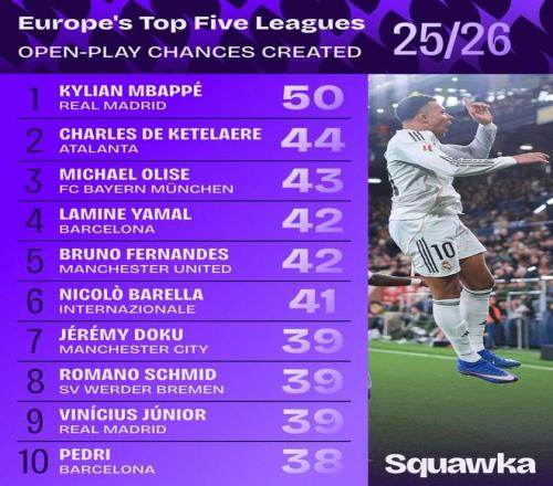 根据统计,本赛季到目前为止,姆巴佩在各项赛事中的运动战已经创造了50次机会,是五大联赛首位达成这一数据的球员。