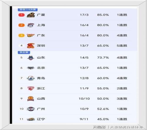 ①、获胜的广厦和上海反超广东,排名前二;