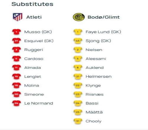 北京时间1月29日04:00,欧冠 联赛阶段第8轮,马德里竞技主场迎战博德闪耀,赛前双方球队首发名单公布如下: