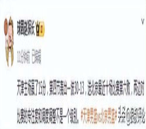 天津主场赢了15分,第四节轰出一波30-13,送北京最近十场比赛第六败,两边对比赛的专注度和调度调整不是一个级别。