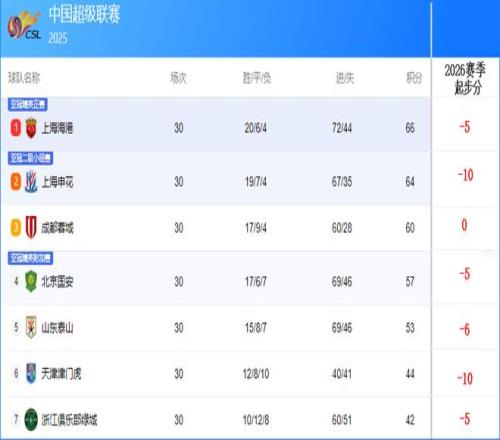 比如去年海港拿66分,扣5分还剩61分。申花64分,扣10分后仅剩54分。成都蓉城依然是60分。北京国安57分扣5分后剩52分。山东泰山扣6分后还有47分。扣分后从高到低的积分排名是:海港61分,成都蓉城60分,上海申花54分,北京国安52分,山东泰山47分