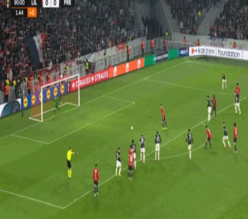 第90+2分钟,帕尔多造点,吉鲁主罚点球命中,里尔1-0弗赖堡