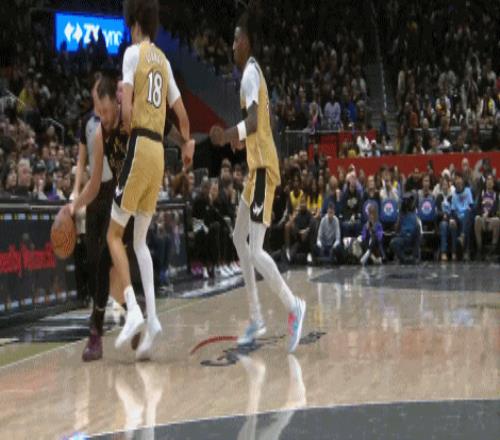 第三节最后1分多钟,奇才已经整整落后了31分,东子只是个在前场简单接个球就遭到了奇才球员的疯狂包夹。