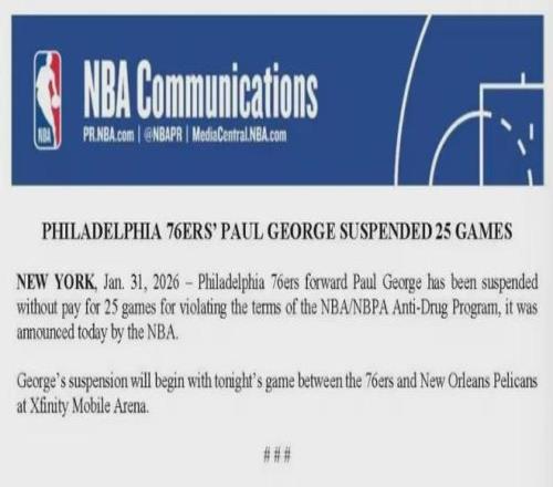 爆料王Shams:乔治因违反联盟禁药政策将被禁赛25场比赛......该消息已经得到NBA官方的确认。