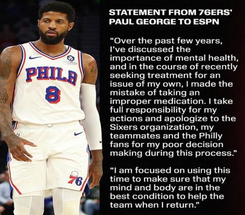 保罗乔治第一时间通过ESPN发布了一份道歉声明,主动承认错误,他在这份声明中写到:过去几年,我一直在讨论心理健康的重要性。最近这段时间,我在寻求治疗自身心理健康问题的过程中,错误地服用了不合适的药物。我愿为自己的行为承担全部责任,并向76人队、我的队友以及费城球迷道歉。我将专注于利用这段时间,确保我的身心处于最佳状态,以便在回归之后能够更好地帮助球队。