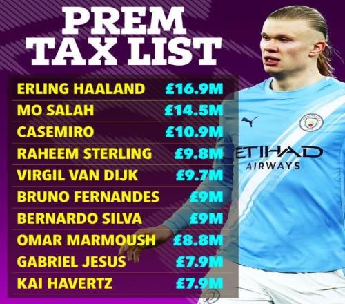 根据《泰晤士报》的调查结果,哈兰德在2025年缴了1690万英镑的税款,远高于英超联赛的其他球员。