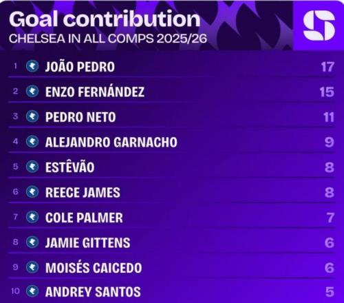 他不仅头球扳回一城,更在最后时刻冷静助攻恩佐绝杀,据Squawka统计,他成为自2022年9月奇尔维尔之后,首位在英超替补登场完成传射的切尔西球员。他以17次参与进球领跑全队,是切尔西进攻端最可靠的终结者。