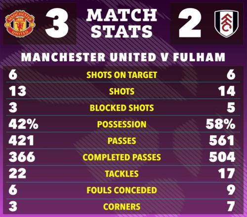 曼联在老特拉福德3-2力克富勒姆,球队上下半场由卡塞米罗和库尼亚各入一球,2-0领先,然而比赛最后5分钟风云突变,富勒姆连入两球扳平。幸好谢什科替补出场完成绝杀,卡里克在弗爵面前上演「弗爵时间」,实现三连胜,守住了前四位置,并且逼近了输球的阿斯顿维拉和曼城。